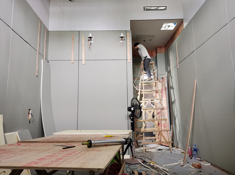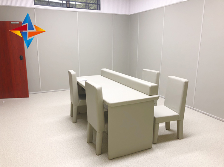 這類材料的外觀較為美觀,并且有很多種顏色可以選擇,審訊室通常使用公安藍(lán),淺灰,淺黃等顏色,鋪滿審訊室四周墻面或是高于人體身高,達到莊重大方的效果。配合燈光,更容易攻破犯罪嫌疑人的心理,幫助辦案。