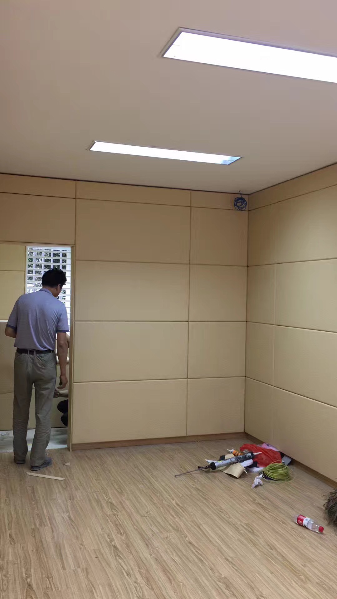 3.施工后,查看軟包墻板邊緣是否有縫隙,如縫隙較大可補膠處理,留置室四周陰陽角施工在軟包背面基材開直角槽,小木條加F30射釘固定墻板,待拆下無脫落現(xiàn)象即可用硅膠中線條封邊。