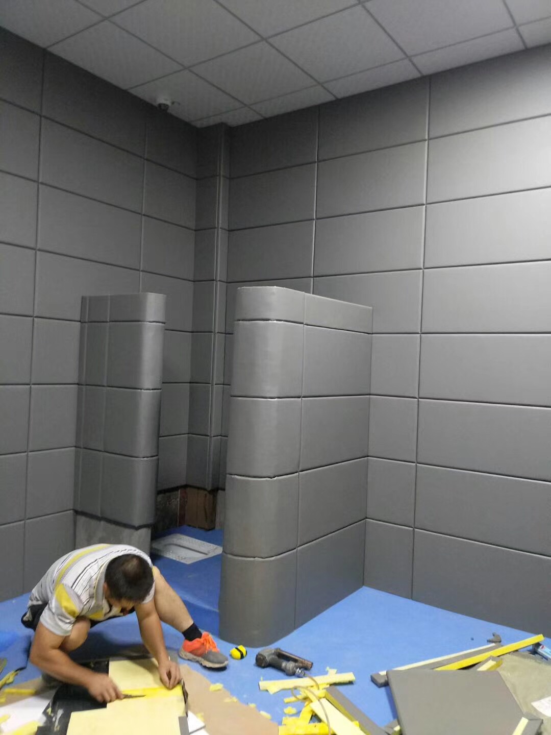 2.施工過程中,碼釘將卡扣類型的硅膠條底座按照預留位置固定,用質(zhì)檢的化工膠水,例如結(jié)構(gòu)膠、環(huán)保免釘膠或是混合比例的強力膠,均勻地抹平在防撞軟包墻板背面與墊層表面并粘合;