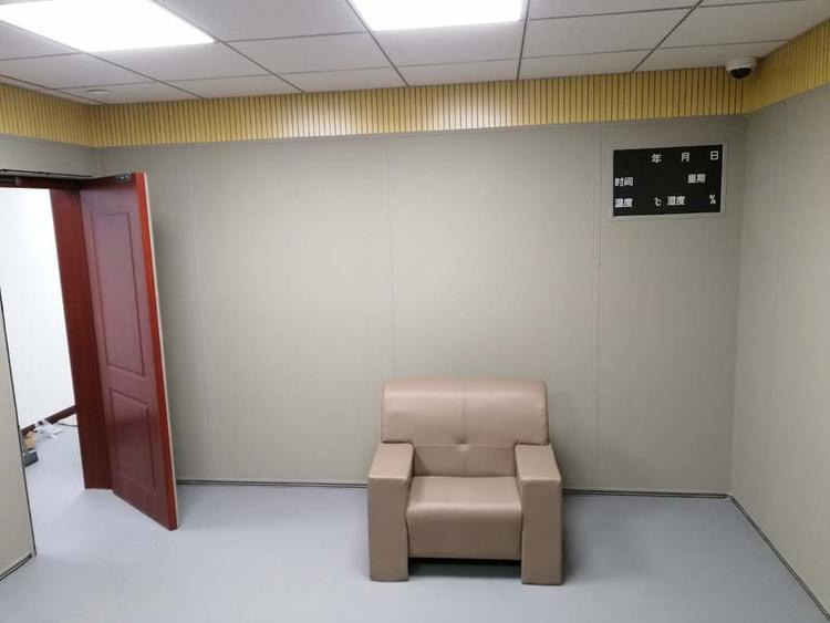為防止被談話人以頭撞墻產(chǎn)生意外,墻面應(yīng)用厚度大于17MM阻燃B1級防撞軟包材料進(jìn)行包裝,不允許意外事件的發(fā)生。考慮到可能采取留置措施,室內(nèi)還需要配備隱蔽式全軟包側(cè)翻床。