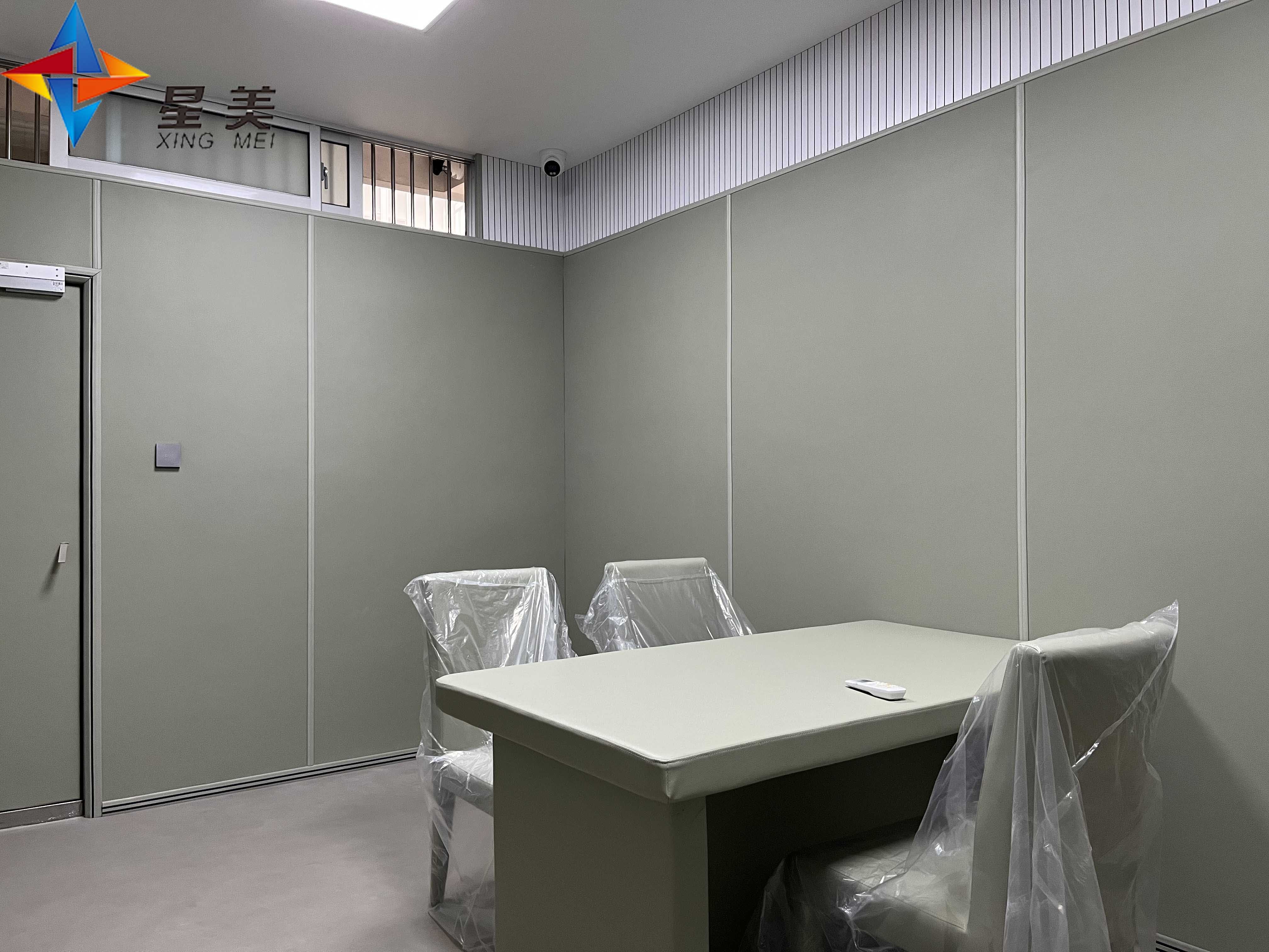 談話室內所能觸及的尖銳物體,硬化物體都需要做防撞防護。為防止在辦案過程中,犯人有過激的行為,選擇自殘或者傷害執(zhí)法人員的情況。需要有三種特性,防火、防撞、吸音(這三個特性顯得尤為重要,符合國家單位場所的材料標準要求(消防、環(huán)保、防火、吸音)。