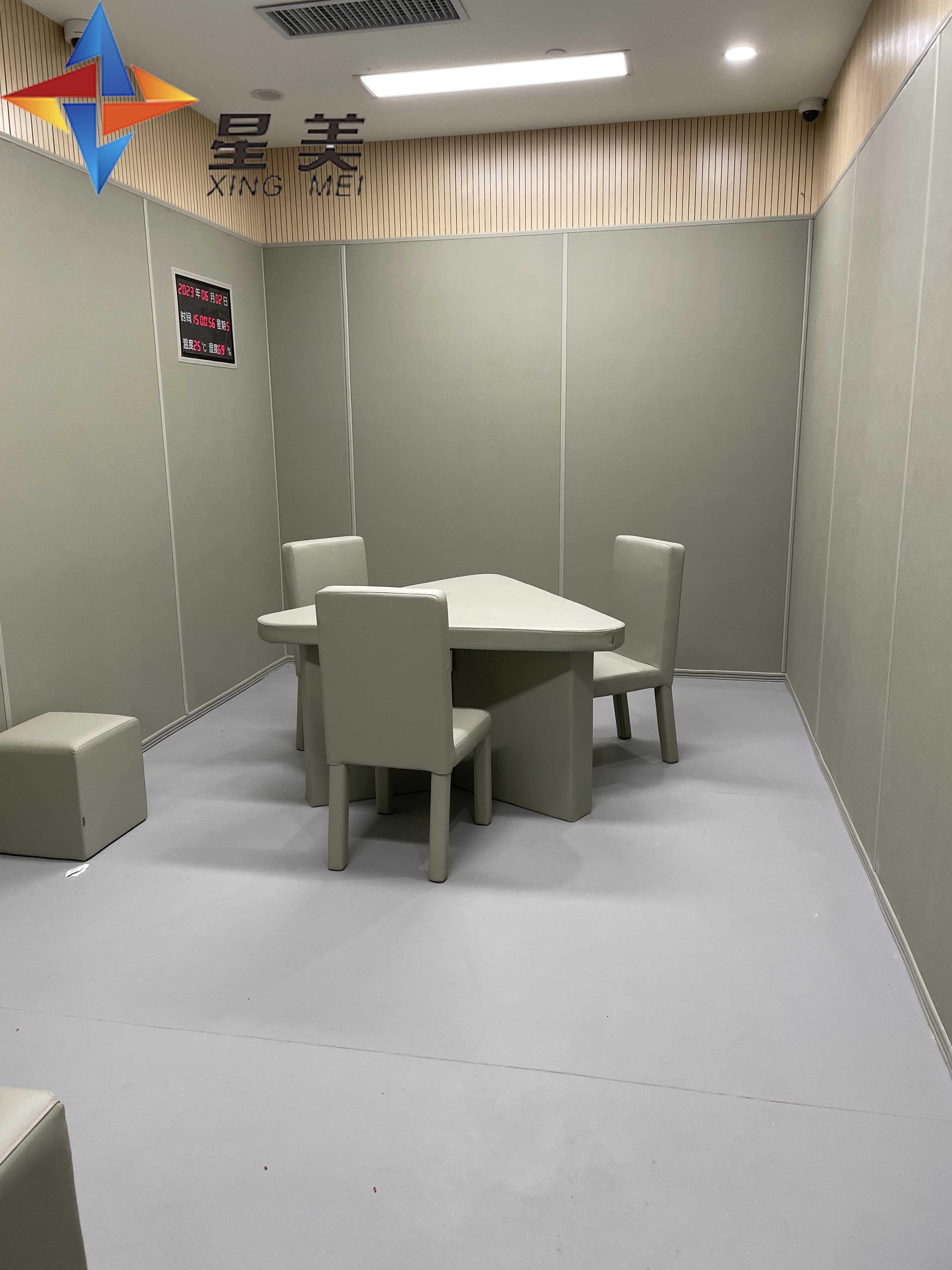 傳統(tǒng)的墻面防撞材料,經(jīng)常會(huì)顧此失彼,所以有不少的短板。要么是防撞性能低,要么是防撞不防火有消防隱患,要么是只能防撞部分地方,不能全面防撞。以前傳統(tǒng)的海綿軟包和玻璃纖維棉軟包材料已經(jīng)不能滿足現(xiàn)代紀(jì)委審訊室的裝修標(biāo)準(zhǔn)了,紀(jì)委審訊室是個(gè)特殊的場所,涉及的都是一些特殊人員,所以對(duì)審訊室裝修要求使用高標(biāo)準(zhǔn)材料,星美聲學(xué)新型紀(jì)委審訊室墻面軟包剛好符合這一特性。