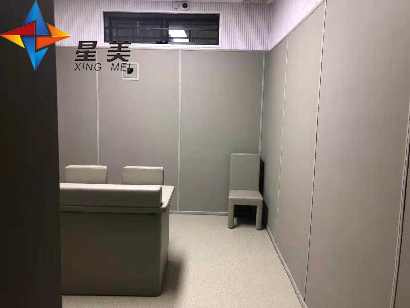 審訊室防撞軟包厚度有17/25mm厚,規(guī)格為1200*2400mm,面飾為人造革,背面貼有鋁箔,基材是高分子納米棉,具有防撞,吸音,環(huán)保,阻燃,防水等功能。檢測報告:B1級阻燃,E1級環(huán)保,適用于紀(jì)檢委,公檢法,監(jiān)察委,審訊室,留置室,談話室,關(guān)押室,公安局等執(zhí)法辦案場所。